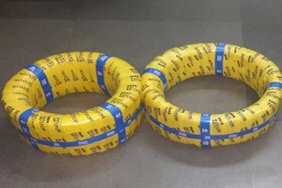 - Yellow colour HDPE packaging with Tata Wiron print, along with blue strap at 4 places and at the circumference of the coil to make it secure, tamper-proof and moisture resistant